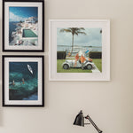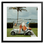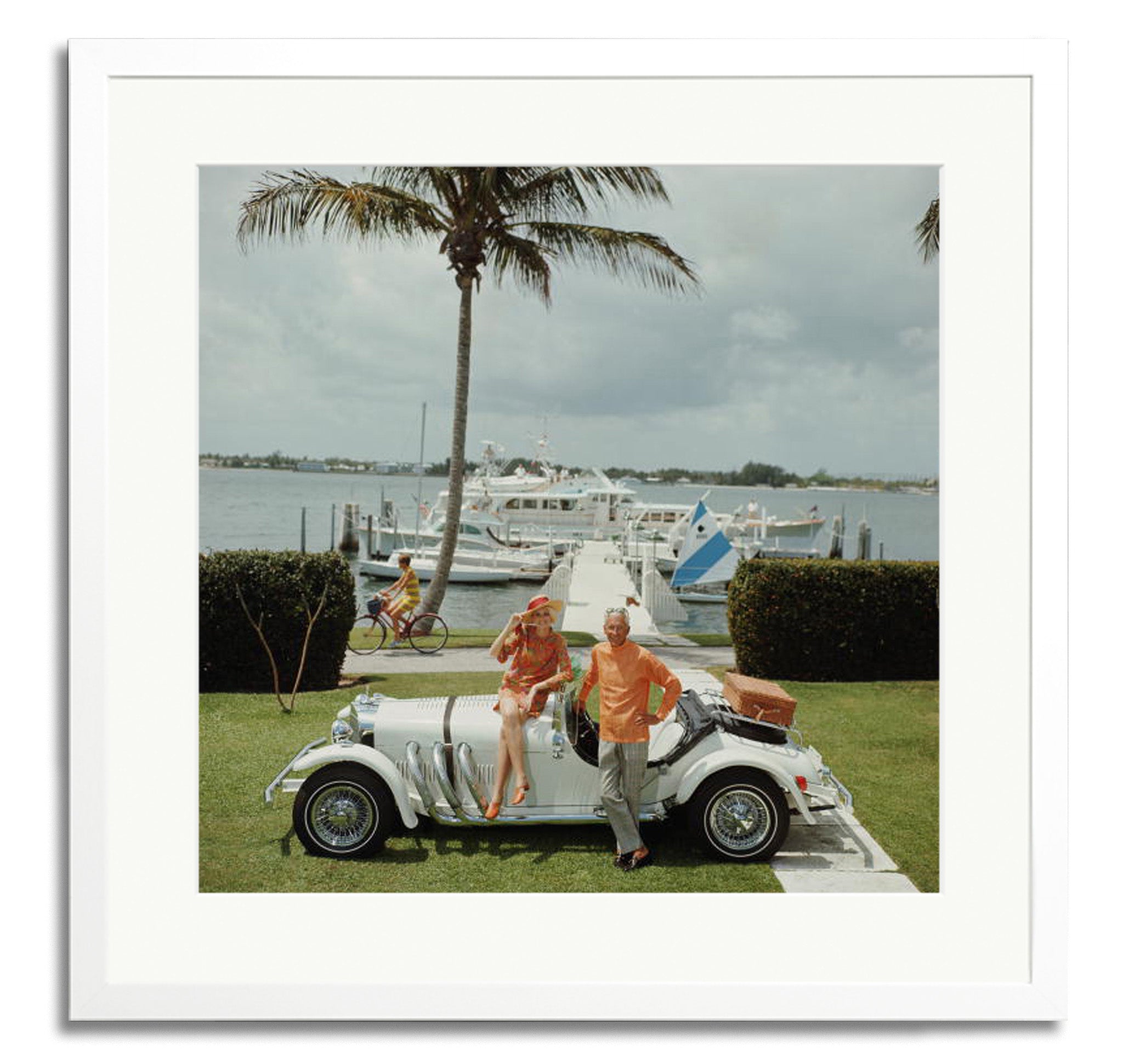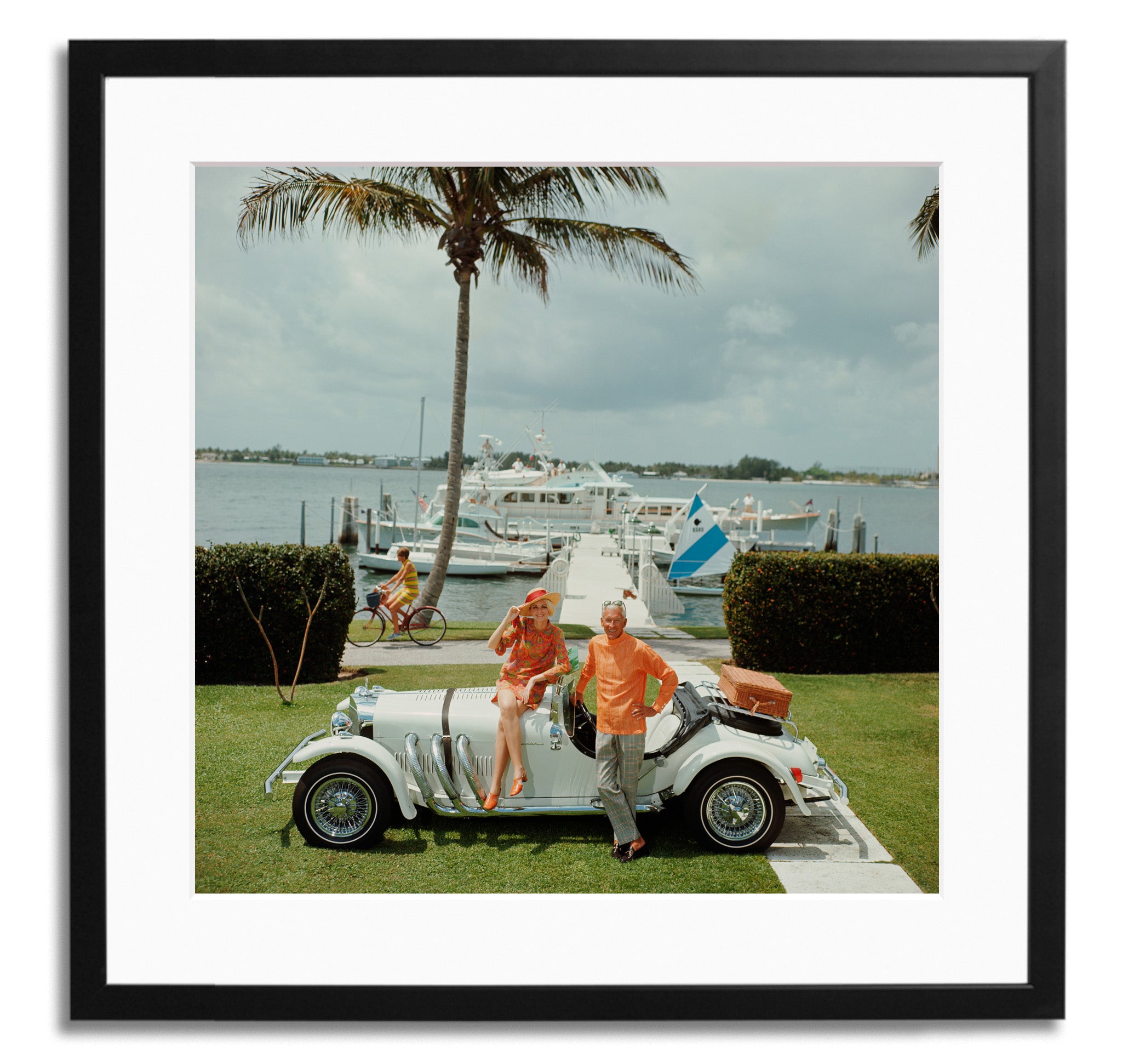 Jim Kimberly and his wife, with his white sports car and white boats moored on Lake Worth, Palm Beach, 1968.