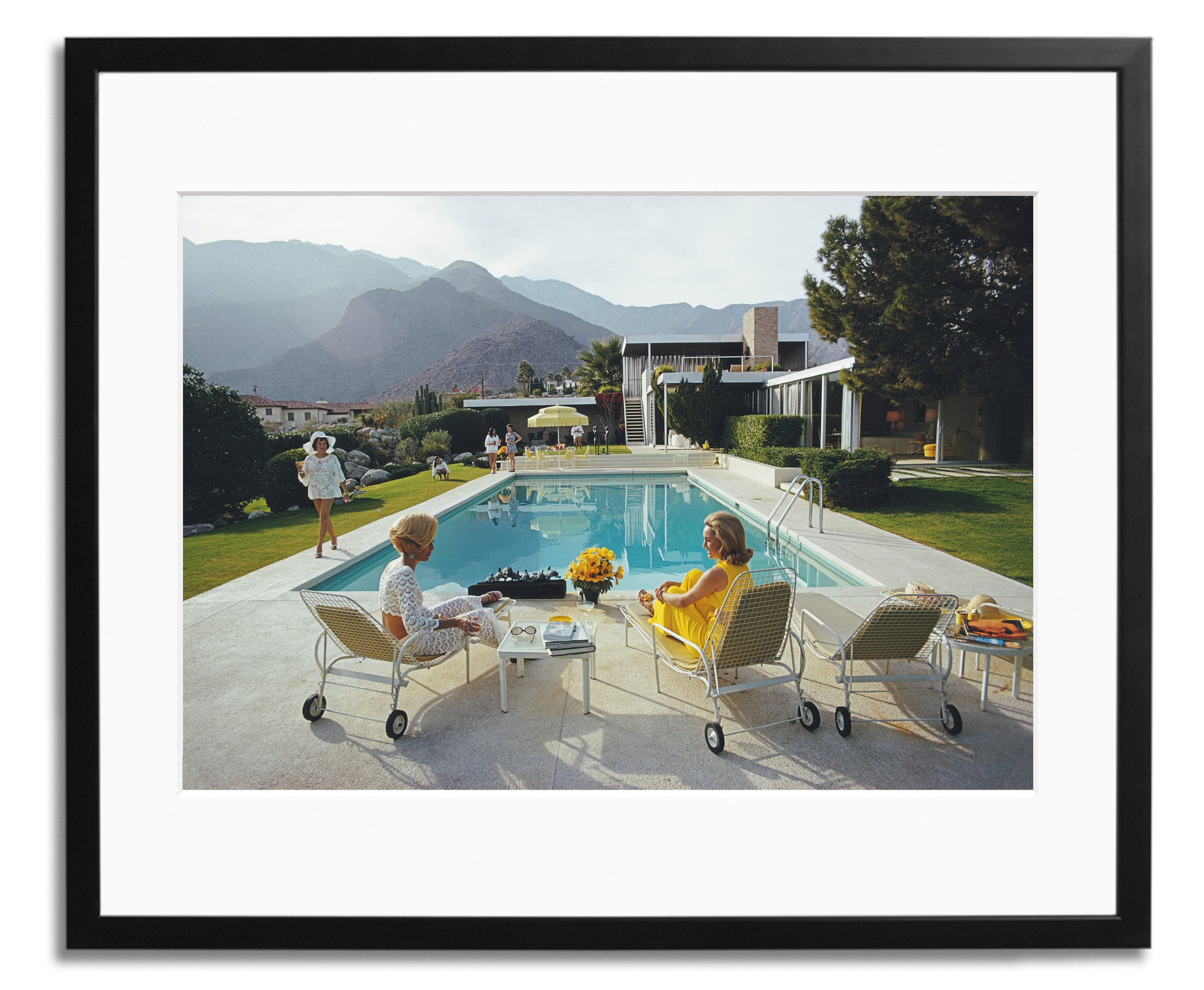 A desert house in Palm Springs designed by Richard Neutra for Edgar J. Kaufmann. Lita Baron approaches Helen Dzo Dzo and Nelda Linsk, wife of art dealer Joseph Linsk.