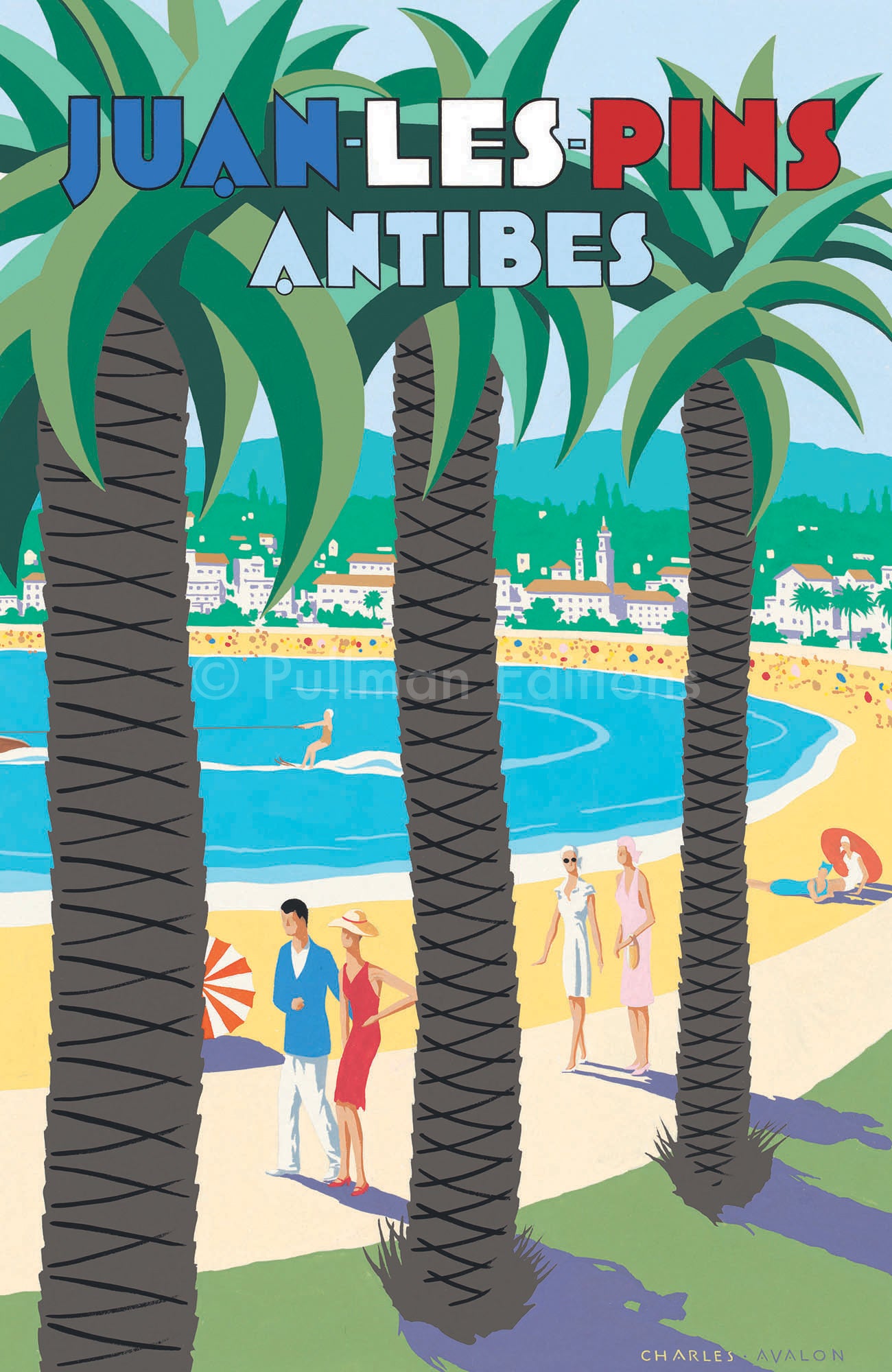 This print by Charles Avalon features Juan-les-Pins. Boasting attractive sandy beaches, a famed night-life and the beautiful Promenade au Soleil, Juan-les-Pins was popular with the international jet-set long, even before Peter Sarstedt's 1969 number one hit.