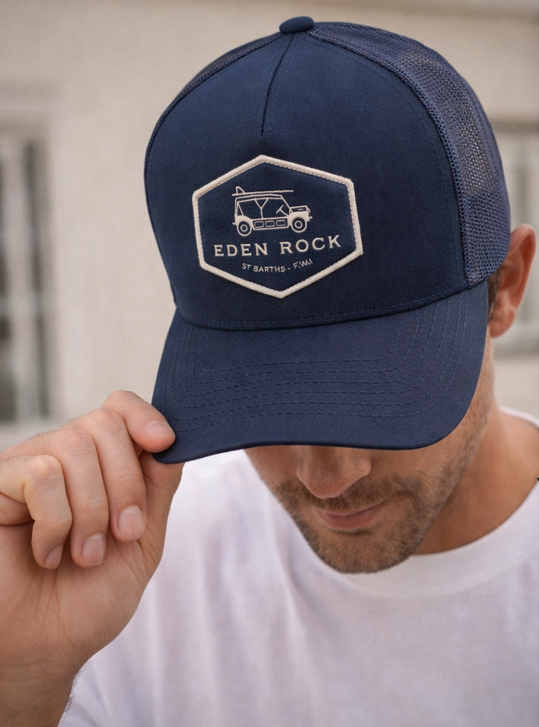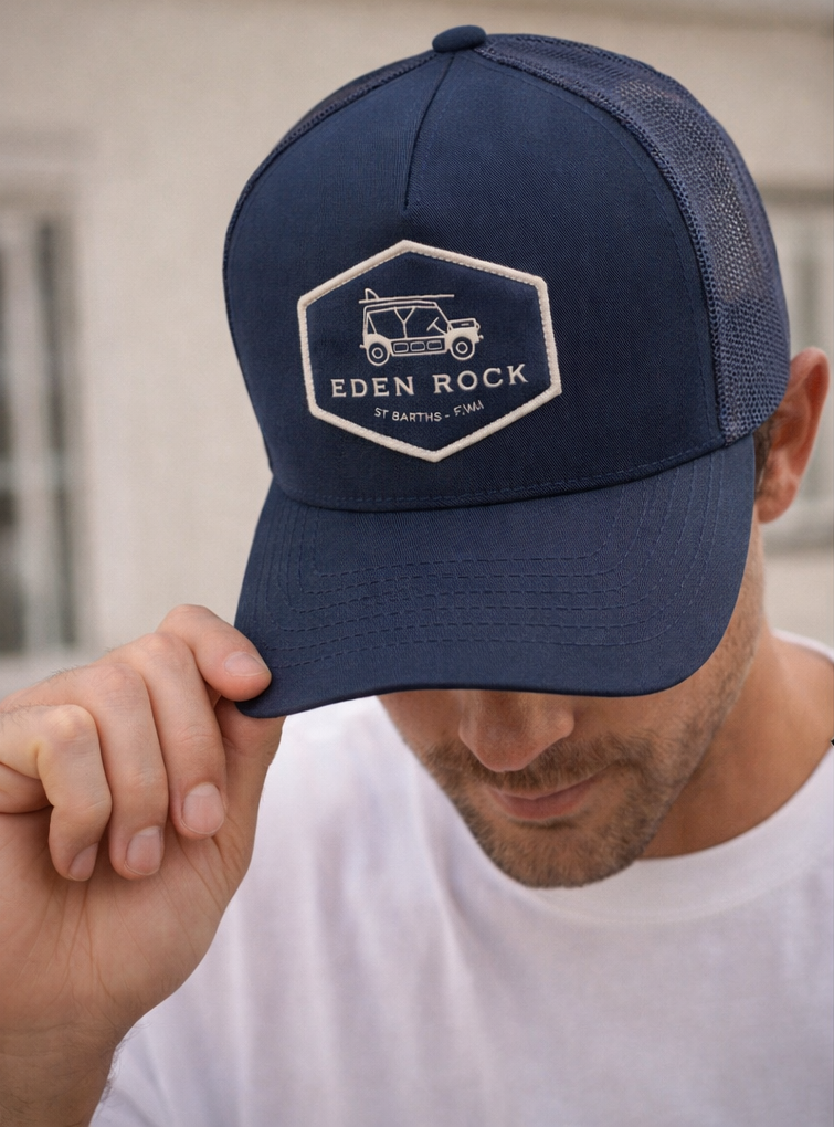 A classic trucker cap featuring the Eden Rock St Barths signature logo patch. Designed with a structured front panel and breathable mesh back, it offers a comfortable fit while maintaining a timeless, sporty look.