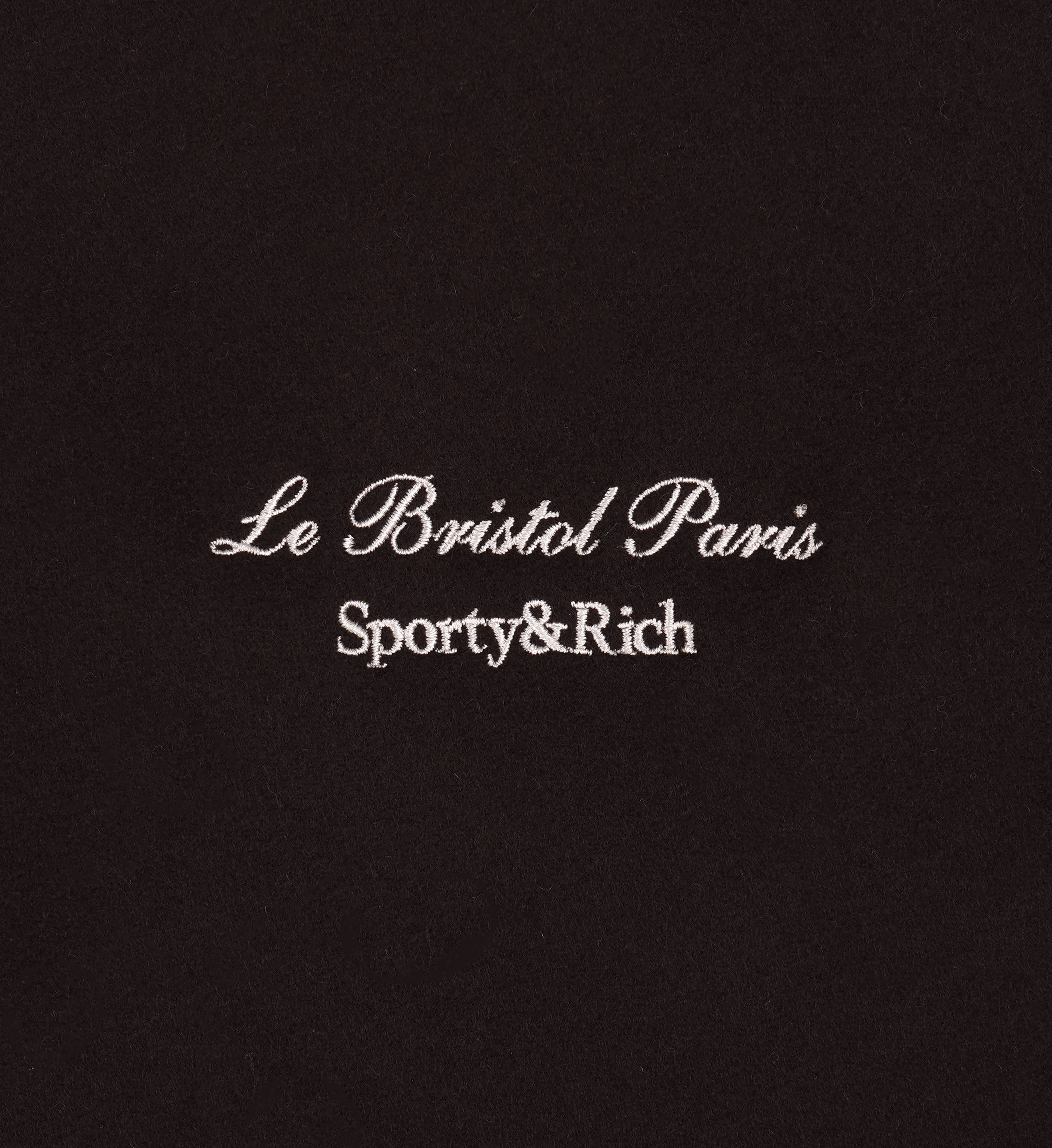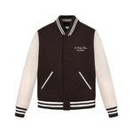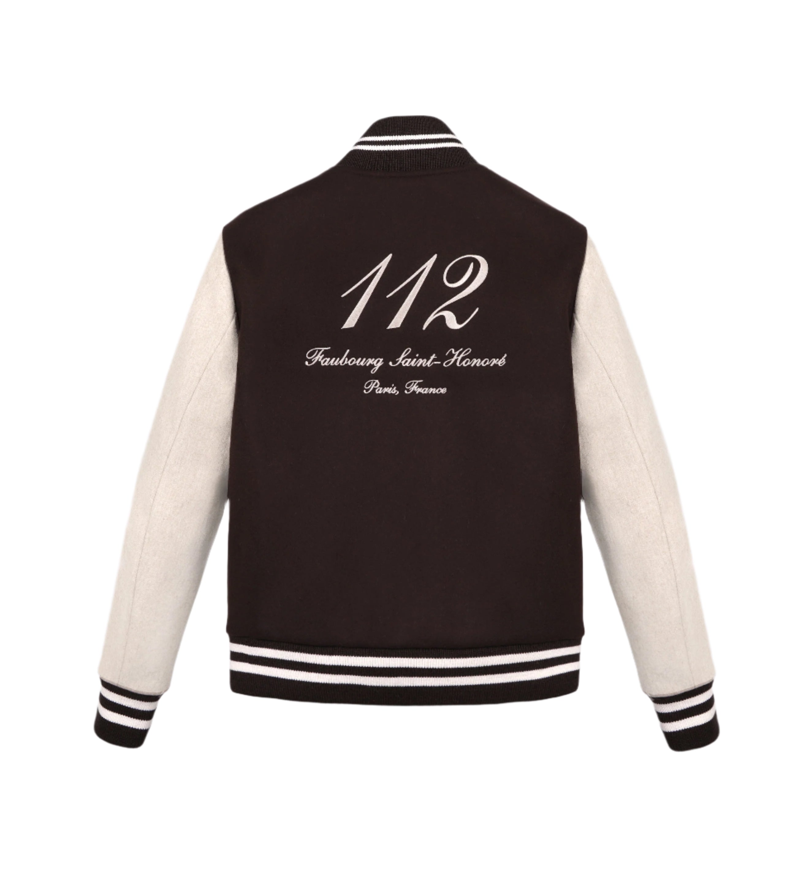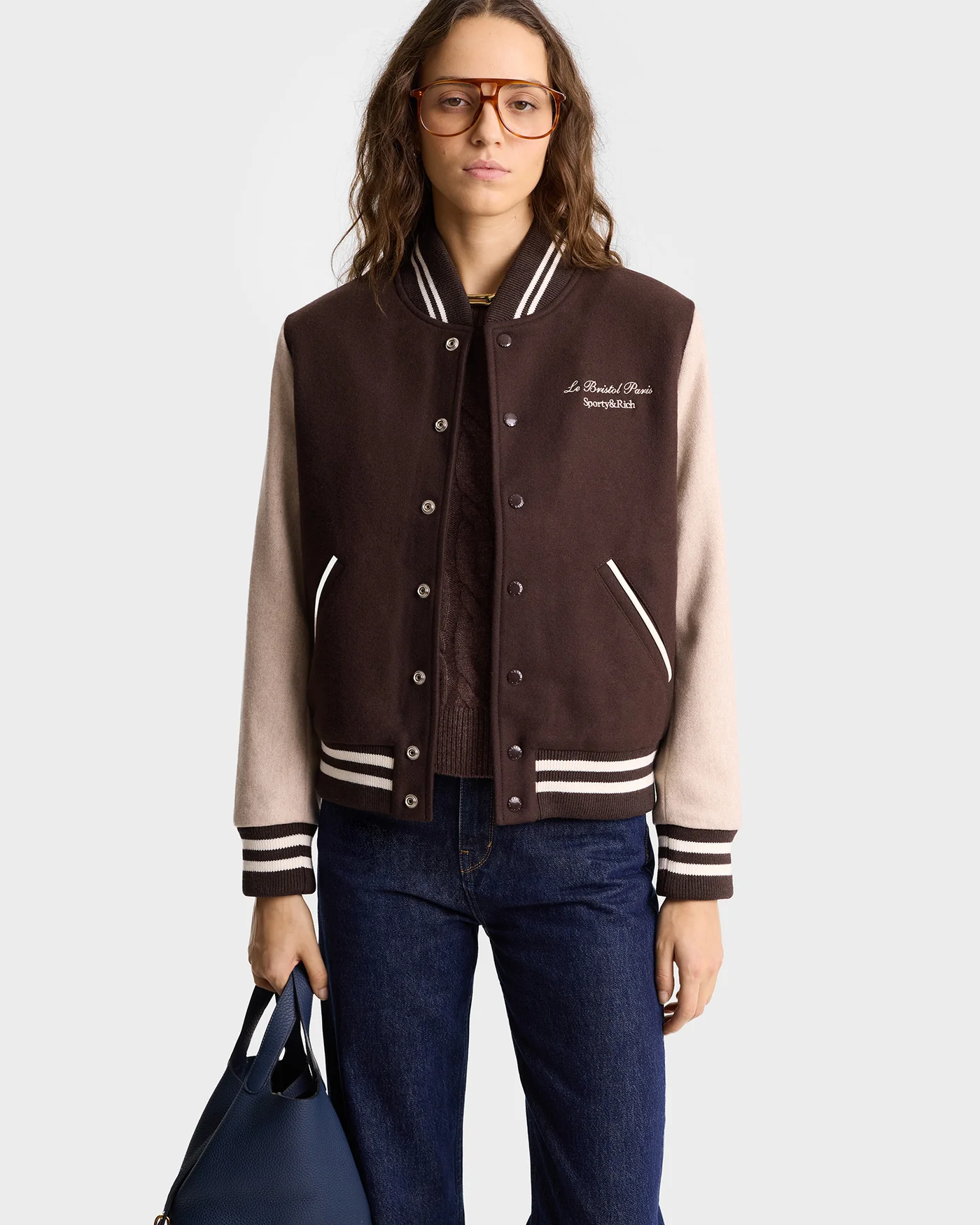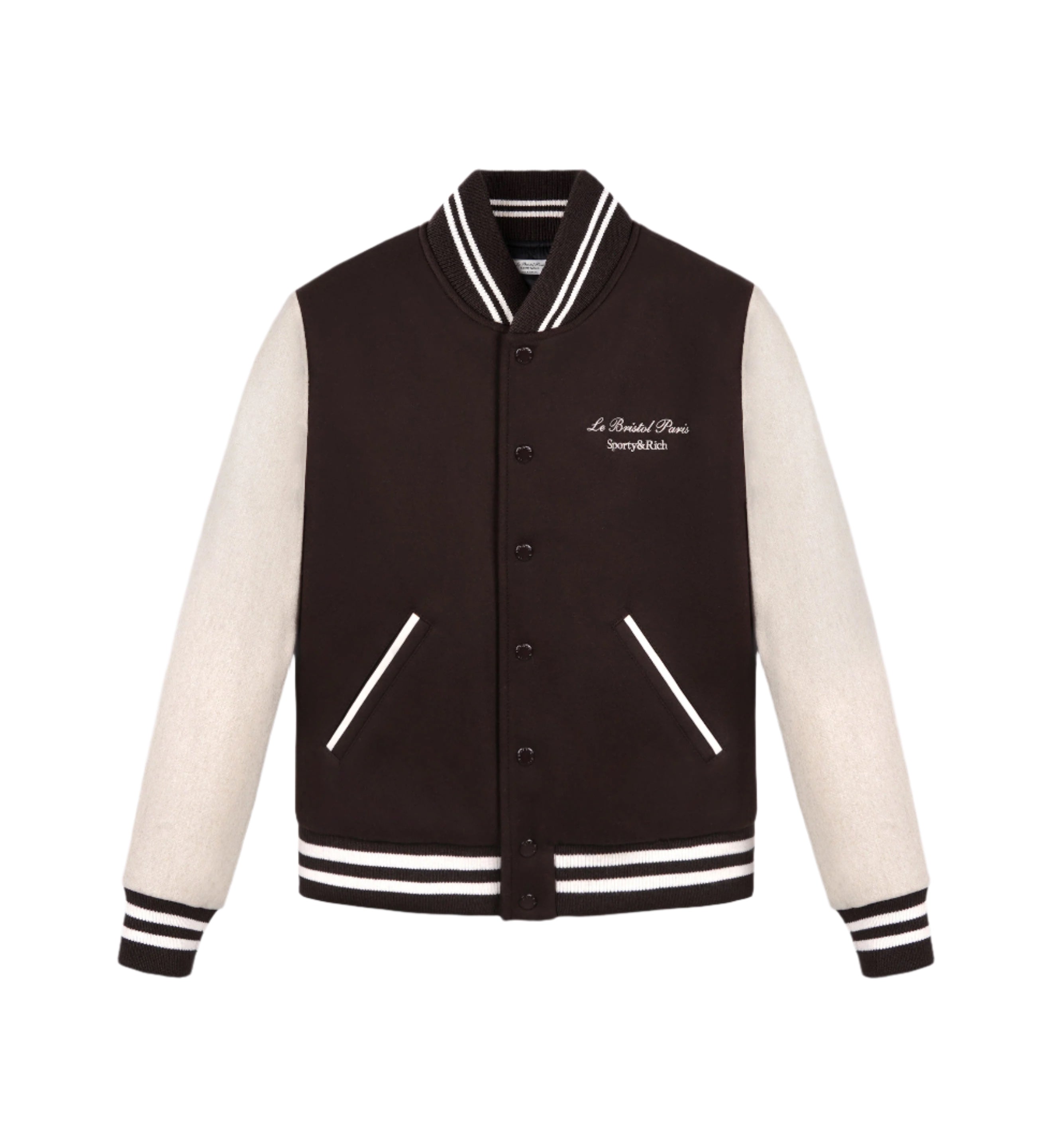 A vintage-inspired varsity jacket in rich chocolate tones, crafted from premium wool with Le Bristol’s signature detailing.