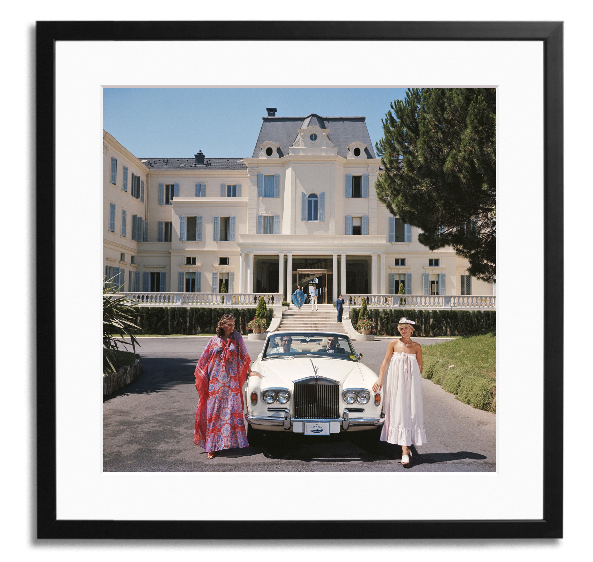 Guests standing by a white Rolls-Royce convertible courtesy car at the Hotel du Cap-Eden-Roc, Antibes, France, August 1976.